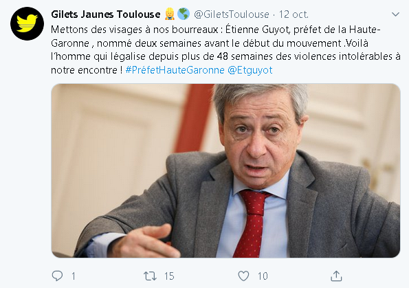 Le message émanait du compte des Gilets jaunes @GiletsToulouse.
