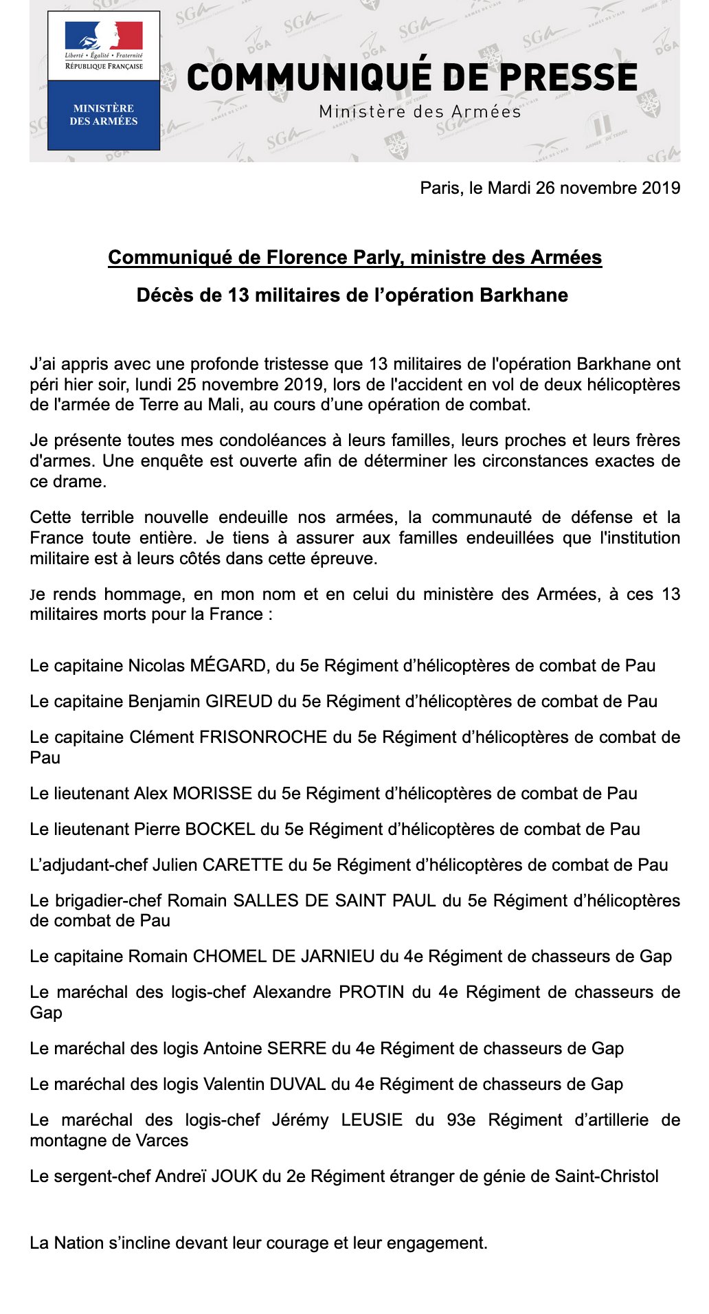 La ministre des Armées Florence Parly vient de publier un communiqué. Il est terrible pour le régiment béarnais. En tout, 7 soldats palois issus du 5e RHC (régiment d'hélicoptères de combat) de Pau sont morts dans la collision :