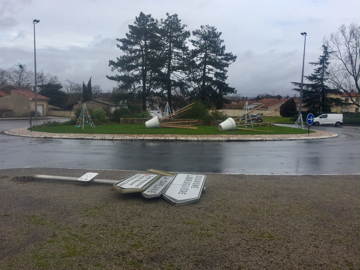 Dans le Tarn, des arbres sont tombés sur certaines routes ce matin, comme à Pont de l'Arn où la route du Golf a été coupée. Chutes d'arbres aussi entre Saliès et Graulhet. Une cheminée est tombée sur une voiture à Négrin, heureusement pas de blessé. A Castres, le Marché de Noël reste fermé ce matin à cause de ces mauvaises conditions météoroligiques. Le vent a fait tomber des décorations de noël sur des ronds-points de la ville (cf photo en une). A Albi, les parcs arborés de la ville sont fermés jusqu’à demain samedi Il s’agit du parc Rochegude et du parc de Castelnau. Quelques sapins installés pour Noël ont été couchés par les Vents violents et remis en place par les services techniques.Enfin, les eaux de l'Agout sont montées.
