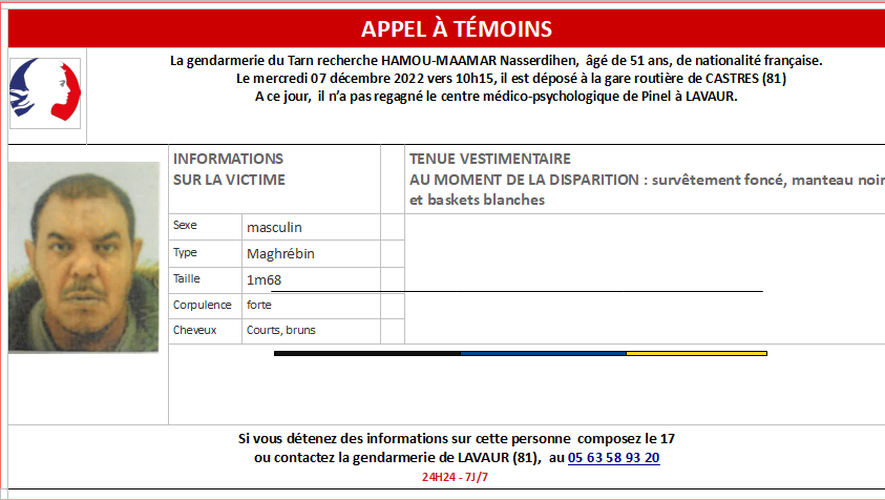 Agé d’une cinquantaine d’années, il est porté disparu depuis Mercredi dernier à Castres. Il n’a pas été revu depuis le milieu de matinée. Il était à la gare routière et devait se rendre à Lavaur au centre médico-psychologique de Pinel.