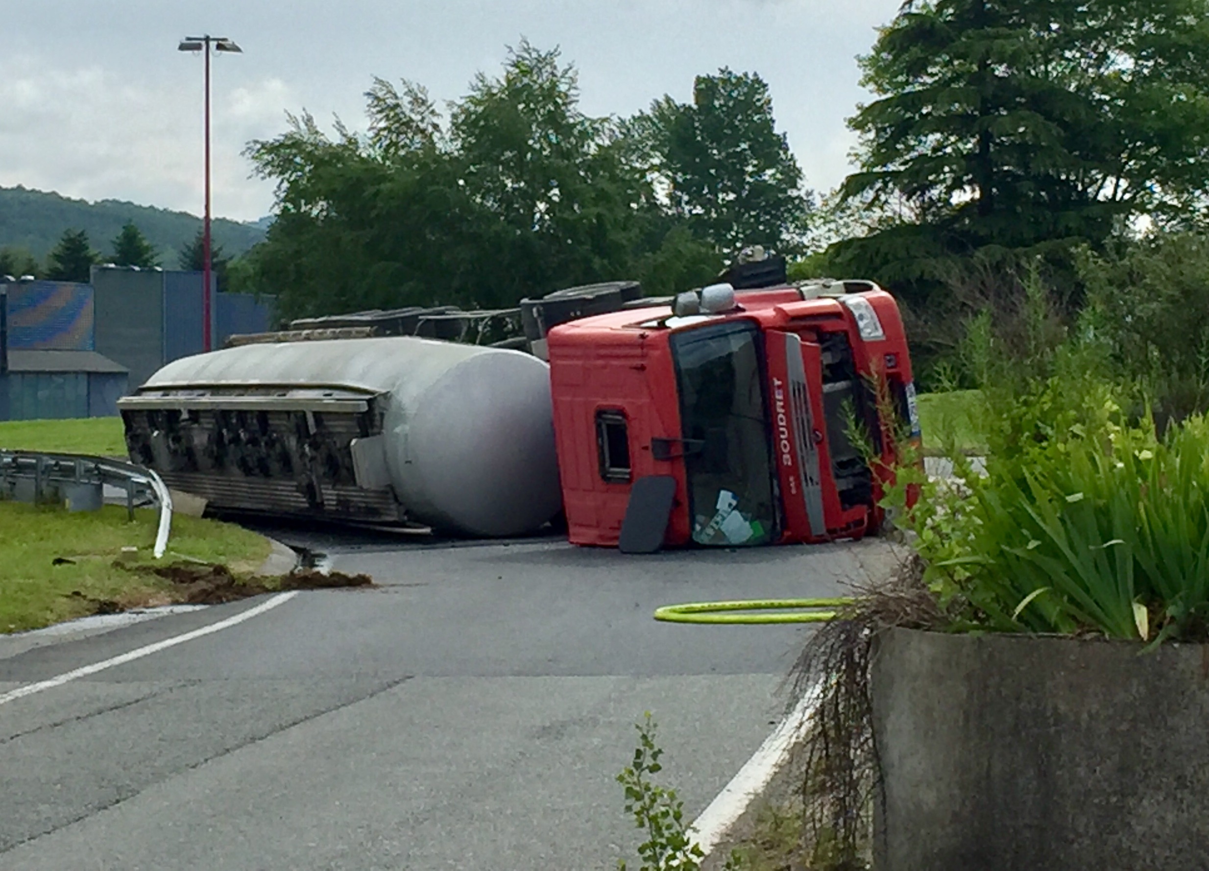 Accident spectaculaire ce matin à Bout-du-Pont de l'Arn. Un poids-lourd s'est renversé en empruntant le rond-point situé tout près du centre Leclerc. Les secours se sont rendus sur place. Plus de peur que de mal, les dégâts ne sont que matériels. Le conducteur du camion n'a pas été blessé, mais choqué. La circulation a été totalement coupée et a partiellement repris vers 11h15. Il y a eu une légère fuite de gazoil.