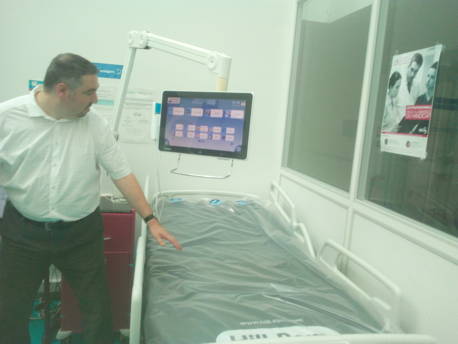 Dans un coin, un lit remplit de capteurs, à côté un écran d'ordinateur indique la position du matelas. Au-dessus, une tablette est fixée à un bras métallique articulé, permet à chacun de regarder la télé, téléphoner ou écouter la radio. Ces modules constituant une chambres connectée sont exposés du 3 au 5 juillet à l’hôpital du Pays d’Autan à Castres pendant l'université d'été de la E-Santé.