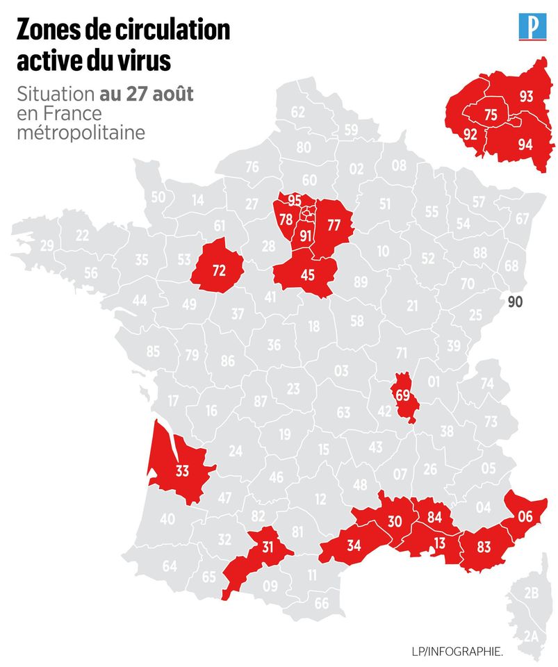Face à l'épidémie du coronavirus qui "progresse", le gouvernement a placé 19 nouveaux départements en zone rouge, connaissant une circulation active du virus, a déclaré jeudi le Premier ministre Jean Castex qui veut "tout faire" pour éviter un "reconfinement généralisé". Avec Paris et les Bouches-du-Rhône, déjà sous cette classification, 21 départements au total sont désormais en zone rouge dont la Haute-Garonne, l'Hérault et le Gard.