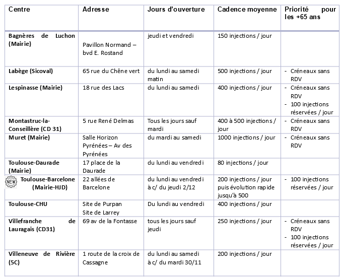Un centre éphémère sera ouvert à Colomiers par le Service départemental d’incendie et de secours à compter du mardi 30 novembre (49 chemin de l’Armurié – gymnase), sur rendez-vous, UNIQUEMENT réservé aux personnes de +65 ans.