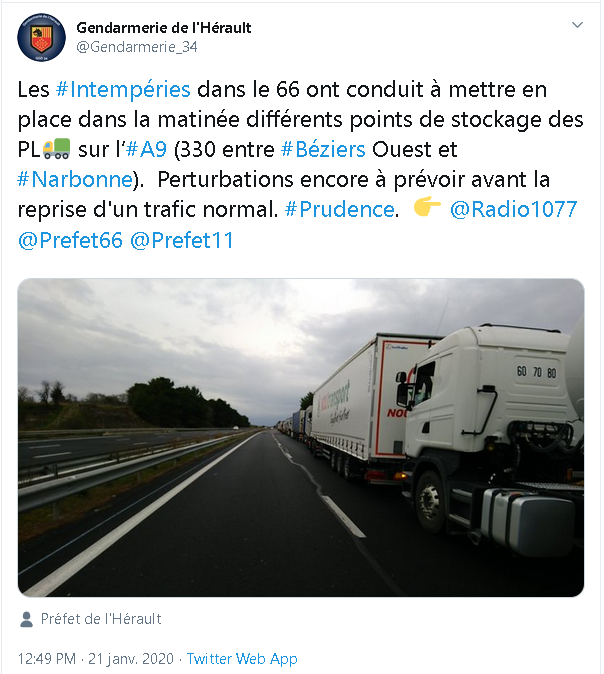 Réouverture de l’A9 fermé dans le sens France-Espagne. 1800 poids lourds stockés vont circuler de façon échelonnée sur l’axe autoroutier. Les véhicules légers peuvent circuler sans équipement. En Espagne l'autoroute AP7 est rouverte depuis 10h.