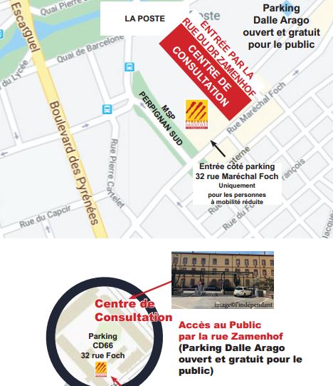 Le centre de consultation de Perpignan est ouvert 7 jours sur 7, de 8h à 20h, se situe dans les locaux du Département : Ancien Hôpital militaire, rue du Docteur Zamenhof, en face de la Dalle Arago, 66000 PERPIGNAN (pour les personnes à mobilité réduite, l’entrée accessible est au 32 avenue du Maréchal Foch). Les usagers automobilistes sont invités à stationner sur le parking de la dalle Arago, ouvert et gratuit pendant toute la durée d’ouverture du centre médical. Numéro : 0 800 08 13 66.