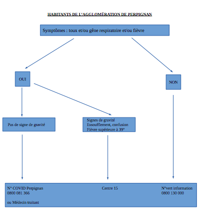Les personnes présentant les premiers symptômes et résidant dans l’agglomération de Perpignan sont invitées à appeler leur médecin traitant ou le numéro vert du centre COVID-19 : 0 800 08 13 66 (joignable 7 jours sur 7 de 8h à 20h) pour savoir si elles doivent, dans un premier temps, rester à leur domicile ou se rendre dans le centre de consultation médicale.