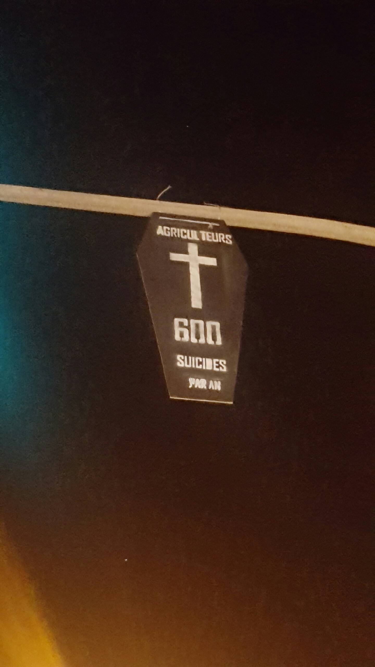 Hier soir, une cinquantaine de jeunes agriculteurs de Tarn-et-Garonne ont mis en place des opérations de communication sur le suicide en agriculture, sur l’ensemble du département. L’objectif de ces messages forts est de sensibiliser au fait que face à des situations économiques catastrophiques, l’épuisement moral fait passer des agriculteurs à l’acte. Une trentaine de ronds-points ont été visés (sur la N113, aux alentours de Caussade et Caylus, ainsi qu’aux entrées de Montauban) : croix, cercueils, pendus et banderoles y ont été placés pour être vus par le plus grand nombre à partir d’aujourd’hui.