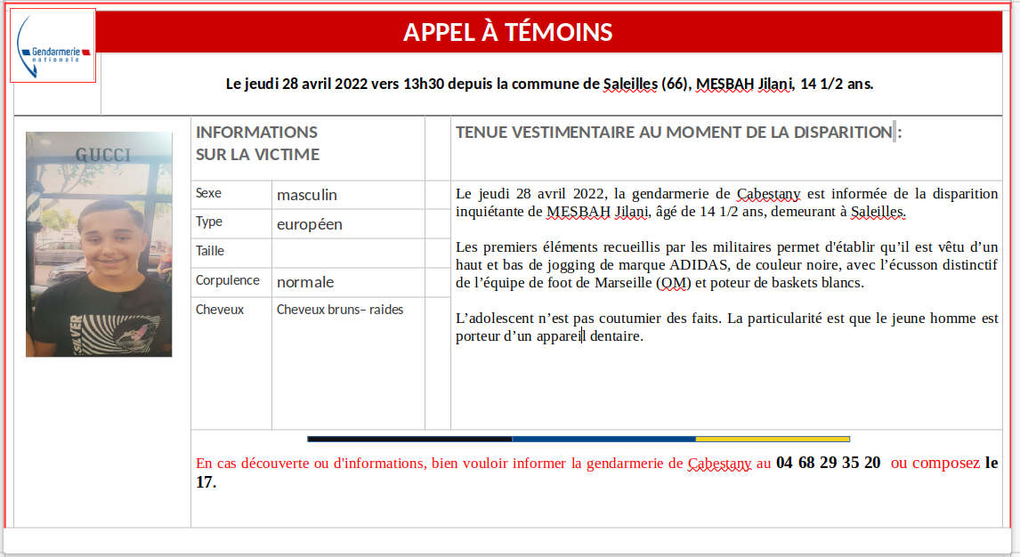 Disparition de Jilani dans les PO (retrouvé à Marseille)
