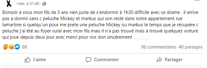 L'élan de générosité des habitants s'est aussi bien fait ressentir pour un tout autre événement. Un père a sollicité les Laurentins après que son enfant ait perdu son doudou Mickey lors du terrible incendie. Ce dernier "n'arrivait plus à dormir", indique le papa sur Facebook. S'en suit alors une pluie de commentaires pour tenter de trouver la petite souris de Disney. Le jeune garçon s'est finalement retrouvé le soir même avec des dizaines de jouets et quelques peluche Mickey. Encore un beau geste à noter.