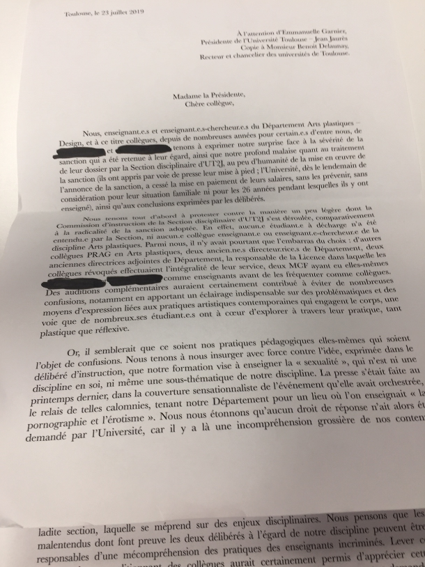 Mai 2019, le syndicat UET (Union des étudiants de Toulouse) alléguait de faits de harcèlement sexuel et moral de la part de deux professeurs agrégés. Depuis les deux quinquagénaires ont été sanctionnés mi-juillet par une commission disciplinaire interne à l’université. Ils sont interdits définitivement « d’exercer des fonctions d’enseignement ou de recherche dans tout établissement public d’enseignement supérieur ». La section disciplinaire considère que leur pratique pédagogique « est contraire à la déontologie de l’enseignant ». À cela s’ajoute une interdiction totale d’enseigner pendant quatre mois prononcée par le Rectorat.