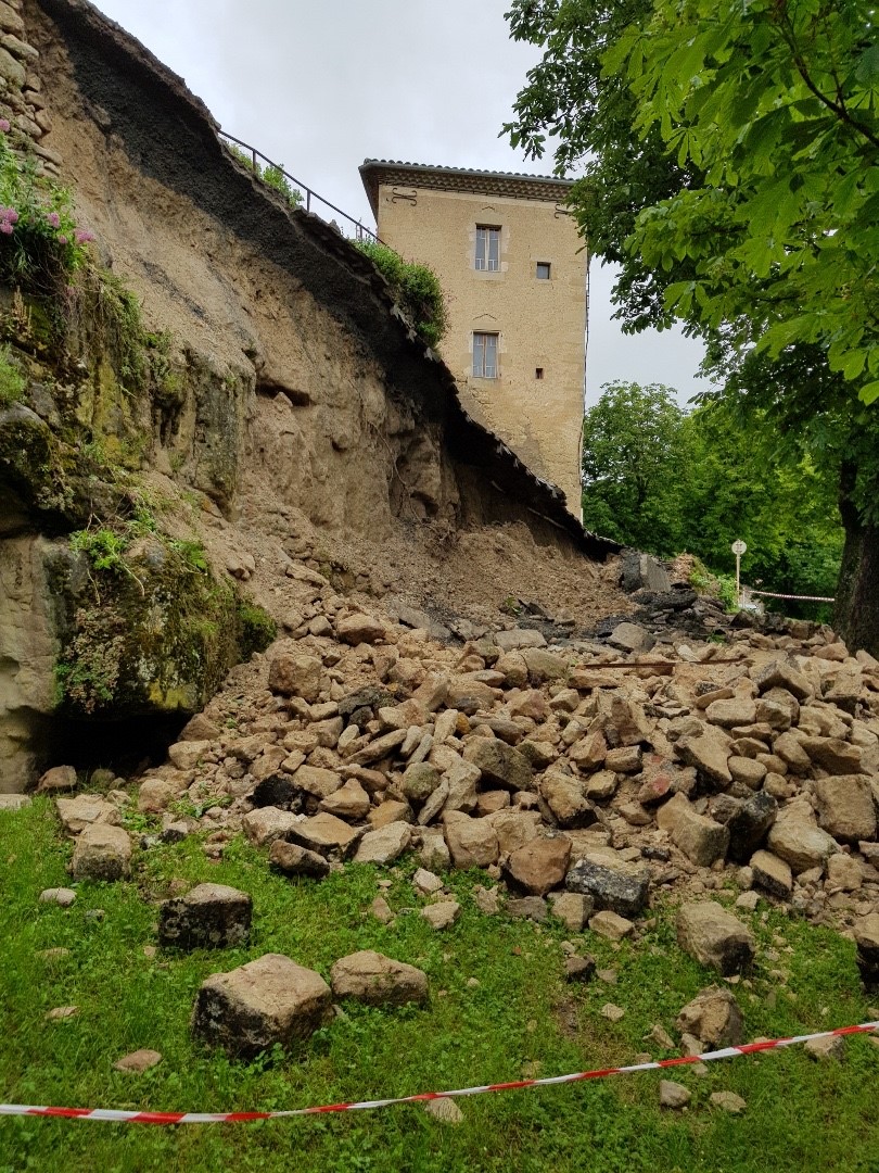 Les pluies ont fait déborder le Bagas (un ruisseau sur la commune) et quelques maisons ont été évacuées ; plus grave un morceau du rempart est tombé " le rempart est endommagé dans la rue de la brèche, elle est encore plus béante" explique le maire Thierry Bardou dans une déclaration teintée d'humour noir.