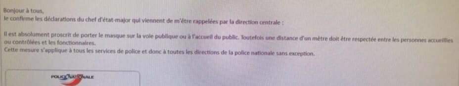 La hiérarchie demande aux policiers de ne pas porter les fameux masques de protection FFP2. Une note interne que 100% s’est procuré indique qu’il est « proscrit de porter le masque sur la voie publique ou à l’accueil du public » ajoutant « toutefois une distance d’un mètre doit être respectée entre les personnes accueillies ou contrôlées et les fonctionnaires. » Les mesures s’appliquent « à tous les services de police et à toutes les directions de la police nationale sans exception. »