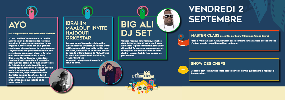 Concerts et live : Ayo, Balbino, Big Ali DJ Set, Cali & friends (Anne Sila, Mickaël Gregorio, Michal Kwiatkowski), Deluxe, Ibrahim Maalouf invite Haïdouti Orkestar, Joeystarr & Dj Pone, Kendji, et Tayc (à noter aussi la présence de Denitsa Ikonomova qui réalisera un flashmob géant avec le public lors de l'une des soirées).