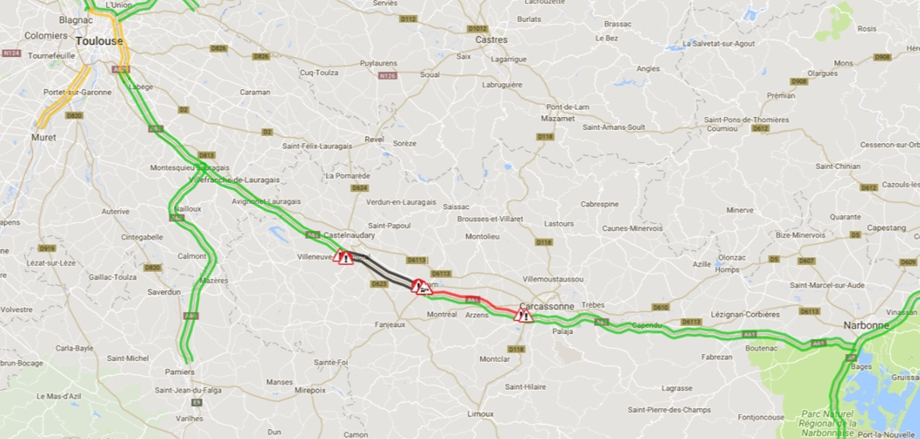 L’autoroute A 61 est coupée dans les deux sens par les agriculteurs. Les véhicules circulant sur l'A61 vers Narbonne en provenance de Toulouse sont déviés vers Pamiers (09) au niveau de l'échangeur A61/A66. Les véhicules circulant sur l'A61 en provenance de Narbonne vers Toulouse sont déviés à partir du péage de Bram (11) vers les départementales situées à l'extérieur de l'autoroute. sortie conseillée à Carcassonne est (n°24). Entrées interdites aux échangeurs de Bram et de Carcassonne ouest (n°23). Entrée déconseillée à Carcassonne est (n°24). Les agriculteurs ont déversé des gravas et brûlé des pneus. Sur la D 6113 : la rocade de Castelnaudary est à éviter. Idem concernant la D119 et la D102 : le secteur Fanjeaux/Gaja est déconseillé en raison de blocages. Les perturbations vont se poursuivre jusqu’à la fin de l’après-midi au minimum. Du périphérique toulousain, pour vous rendrez dans l'Aude, prenez la sortie n°18 Montaudran et suivez la RD2 vers Saint-Félix-Lauragais puis la RD 622 direction Castres puis Mazamet.