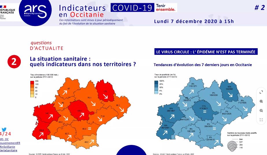L'ARS fait bien attention à ne pas parler de "reprise", pour autant les spécialistes s'inquiètent au vu de la tendance de ces derniers jours, "nous sommes sur un plateau et non plus sur une baisse". "Nous devons redoubler de vigilance" pour que "l'épidémie ne s'invite pas aux fêtes de fin d'année". L'heure n'est donc plus à "une baisse franche" notamment dans des départements comme le Gers, les Hautes-Pyrénées ou le Tarn "qui a connu un rebond des hospitalisations". "Nous ne sommes pas redescendus assez bas" pour être "totalement tranquille" à l'approche de Noël conclut l'ARS. Les fêtes de fin d'années "ne pourront pas se dérouler de manière habituelle" martèle le DG de l'agence régionale de santé, "si nous voulons éviter un rebond épidémique" ; appelant à maintenir les gestes barrières.