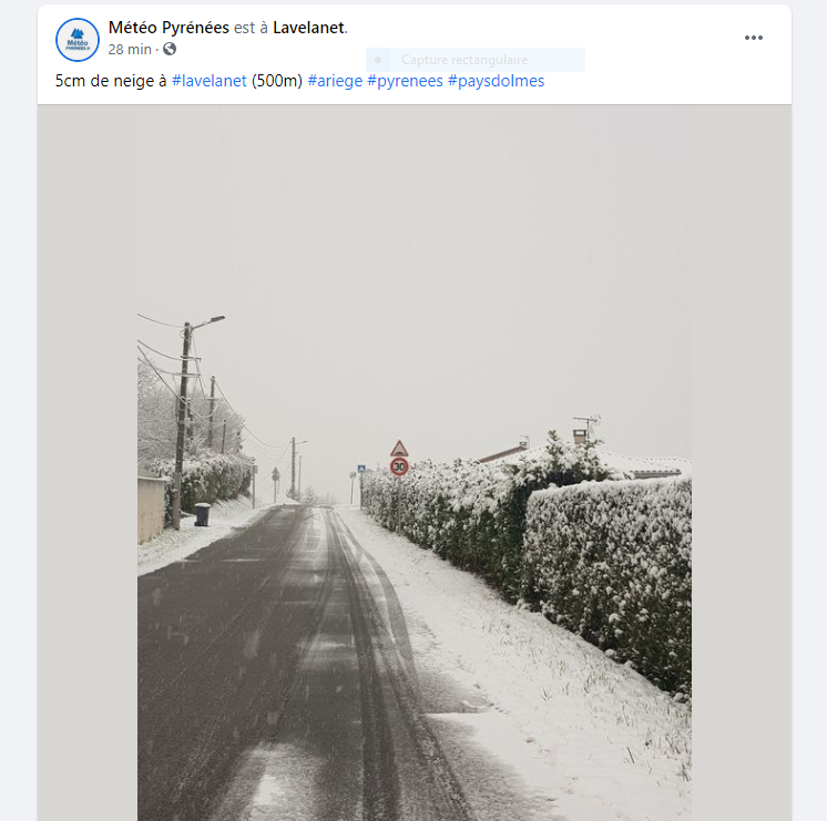 ❄ Si la neige ne tient pas à #Toulouse, une fine pellicule se forme en dehors de la ville. Photo à Rangueil au sud de l'agglomération. (via @stormchaser_a81) pic.twitter.com/9Ues5SAwoM