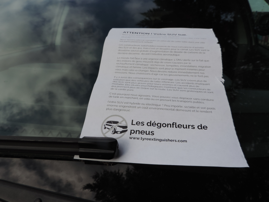 Inspirés d’activistes anglais, les auteurs, une poignée de militants de "NoSuvTolosa" spécialisés en désobéissance civile, multiplient ce type d’actions sur des véhicules stationnés, voitures qu’ils estiment particulièrement polluantes. On pense qu’il y a déjà eu une dizaine d’actions sur la Ville rose et 200 à 400 véhicules dégonflés. Nous avons pu rencontrer l’un de ces militants, Arthur *, sa technique est simple : « on enlève le capuchon, on met une lentille ou un haricot, on referme de sorte à dégonfler le pneu » explique celui pour qui « le SUV est le symbole d’un privilège : des véhicules toujours plus gros et plus pollueurs alors qu’on nous demande d’aller vers la sobriété » ; « on laisse toujours un papier pour expliquer le mode d’action » précise-t-il.