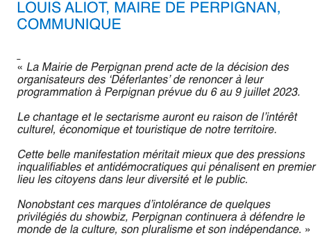 "Le chantage et le sectarisme auront eu raison de l'intérêt culturel, économique et touristique de notre territoire", déplore le maire du Rassemblement National. "Cette belle manifestation méritait mieux que des pressions inqualifiables et antidémocratiques qui pénalisent en premier lieu les citoyens dans leur diversité et le public", ajoute-t-il. Un vrai coup dur pour l'élu qui espérait accueillir cette année le plus gros festival d'Occitanie dans sa ville.