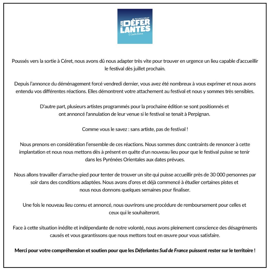 Les Déferlantes avaient initialement lieu à Argelès-sur-Mer, jusqu'en 2021, puis avaient déménagé à Céret (lieu historique) où les organisateurs disent avoir "été poussés vers la sortie", optant pour Perpignan dont la mairie se montrait ravie de les accueillir cette année. Ce ne sera finalement pas le cas.