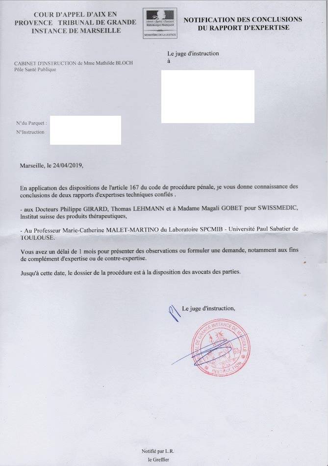 Le 24 avril dernier, un courrier émanant du cabinet de la juge d'instruction Mathilde Bloch du Pôle santé publique du TGI de Marseille, indique que les deux rapports d'expertises réalisées par l’institut Swiss Médic et le laboratoire SPCMIB de Toulouse, évoquent des lots de Lévothyrox "qualitativement conformes."