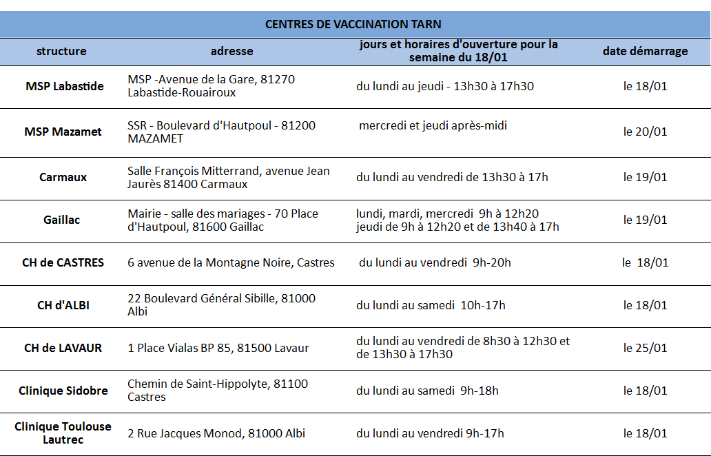 La deuxième phase vaccination dans le Tarn commence lundi 18 janvier, pour les plus de 75 ans, mais aussi pour les personnes atteintes d’une pathologie à haut risque de développer des formes graves de Covid19 (par exemple les patients souffrant d'insuffisance rénale chronique, les personnes traitées pour cancer, greffées, ou trisomiques...). Les centres n'ouvrent pas tous lundi (voir le tableau ci-dessous). La vaccination ne peut se faire que sur rendez-vous :