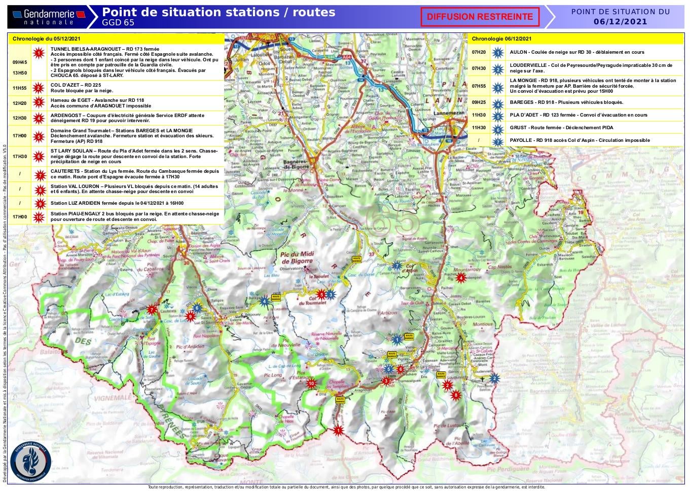 L'action des gendarmes "s'est terminée tard dans la nuit pour reprendre tôt ce matin, notamment pour faire respecter les interdictions de circulation sur les routes à risques marqués d'avalanches" précise le groupement de gendarmerie 65.