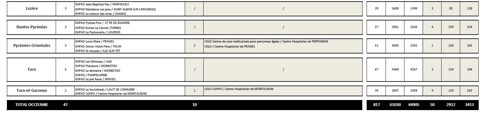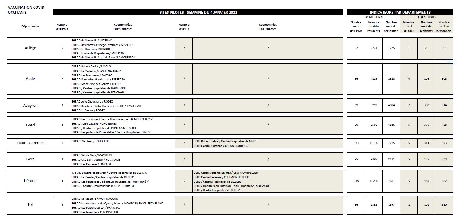 L'Agence régionale de santé Occitanie vient de communiquer la liste des 57 premiers sites prévus pour la vaccination Covid19dans la région. Elle début ce lundi 4 janvier. La première session de vaccination concerne 47 EHPAD et 10 USLD (Unités de soins de longue durée) répartis sur les 13 départements de la région.