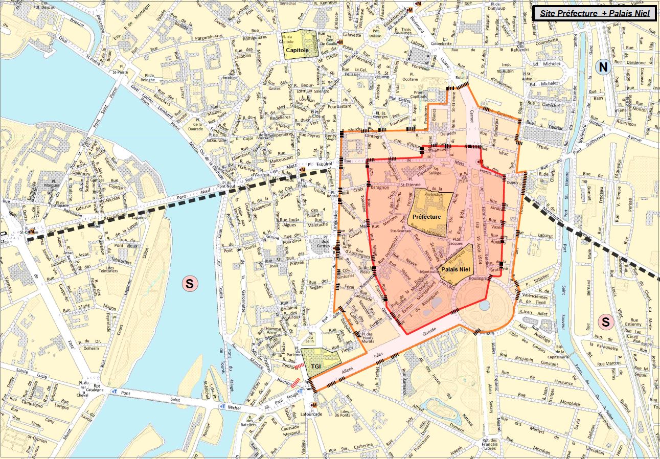 Le mercredi 16 octobre 2019 de 9h00 à 23h00 sera instauré un périmètre de protection dans le centre-ville de Toulouse, figuré en orange sur le plan.