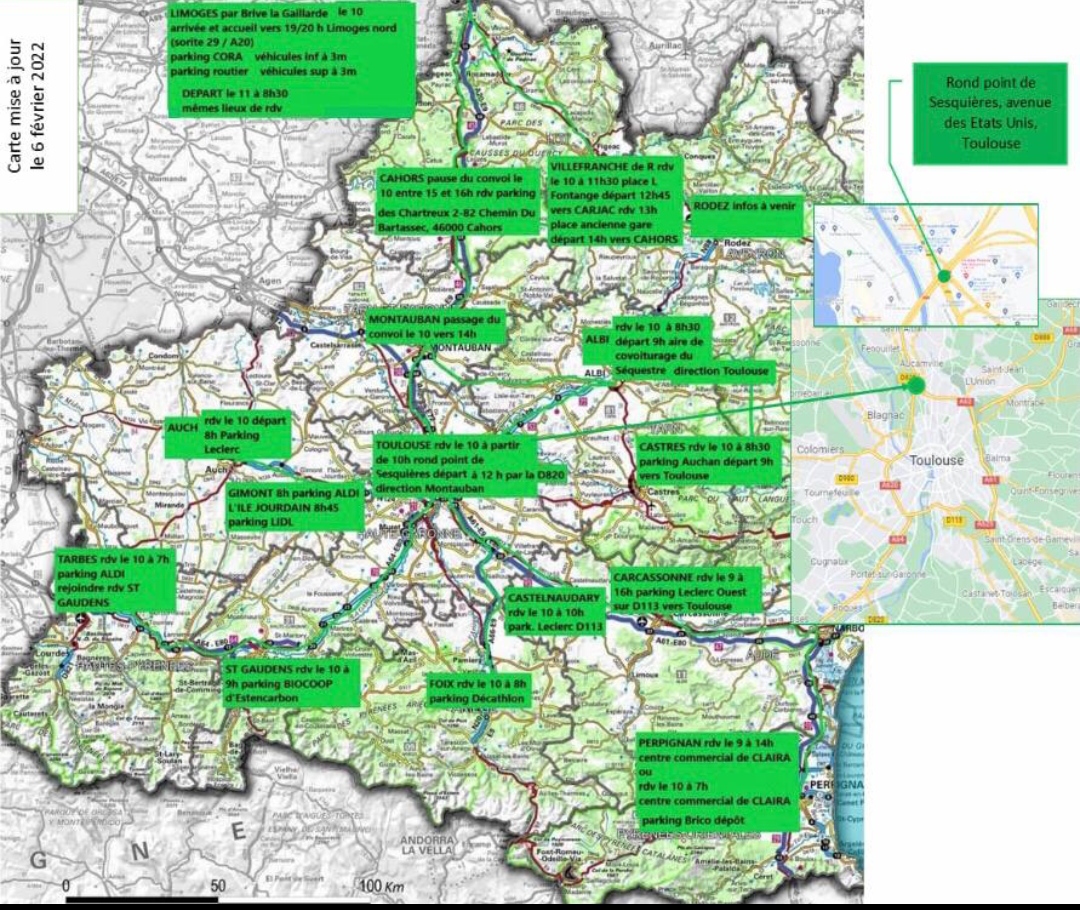 Le convoi, rassemblé à Toulouse partira ensuite pour Montauban et fera une première halte à Limoges. Au départ de Perpignan, les « routiers », rappellent que l'objectif « n'est pas de bloquer les routes », mais de rallier la capitale en attirant l'attention sur le trajet.