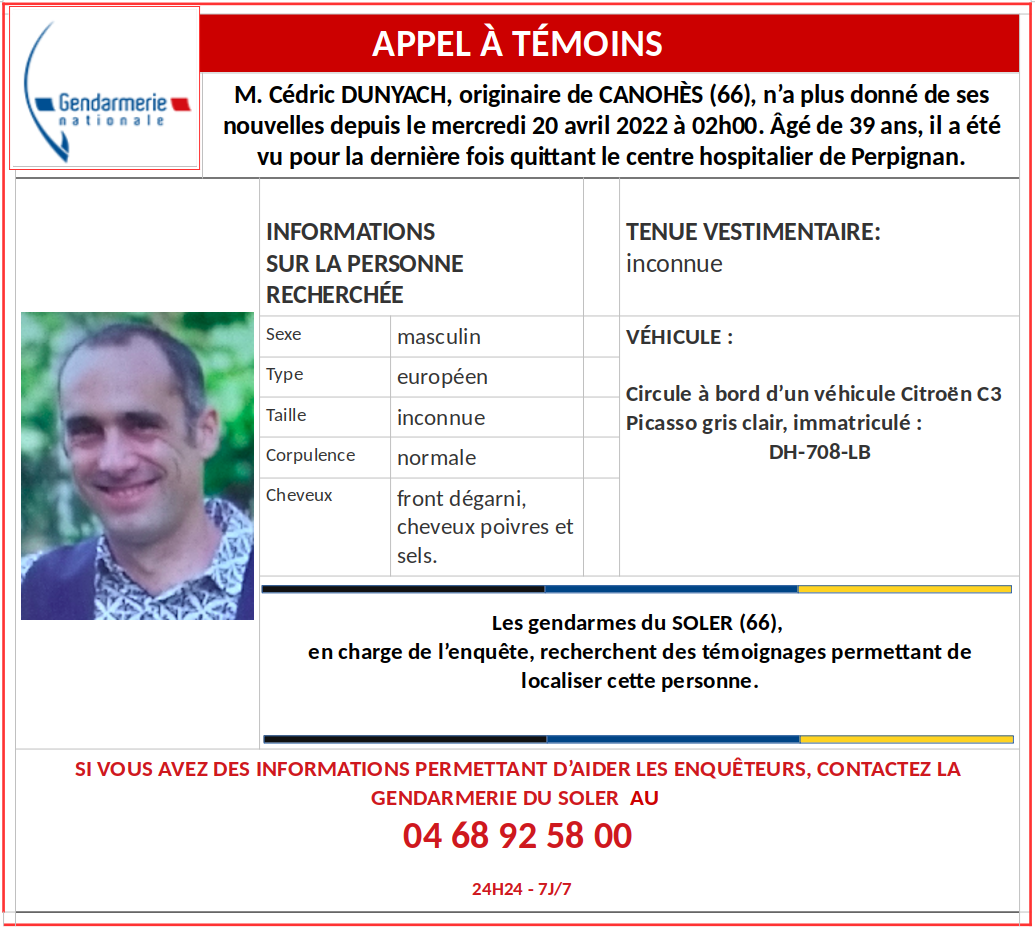 Cédric Dunyach est de corpulence mince, il a les cheveux poivre et sel, le front dégarni et circule à bord d’une Citroën C3 gris clair. Si vous avez des informations permettant d’aider les enquêteurs, contactez la gendarmerie du Soler au 04.68.92.58.00.