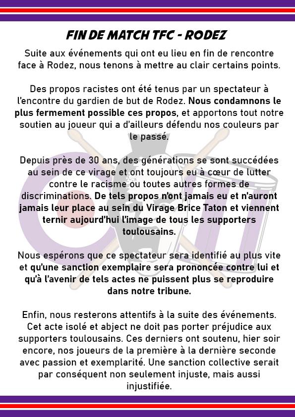 La fin de match entre le Toulouse Football Club et le Rodez Aveyron Football "a été entachée par des propos à caractère raciste à l’encontre d’un joueur de l’équipe visiteuse, tenus en tribune Brice-Taton par un spectateur " indique le TFC dans un communiqué. C'est le portier de Rodez qui a été la cible d'insultes.