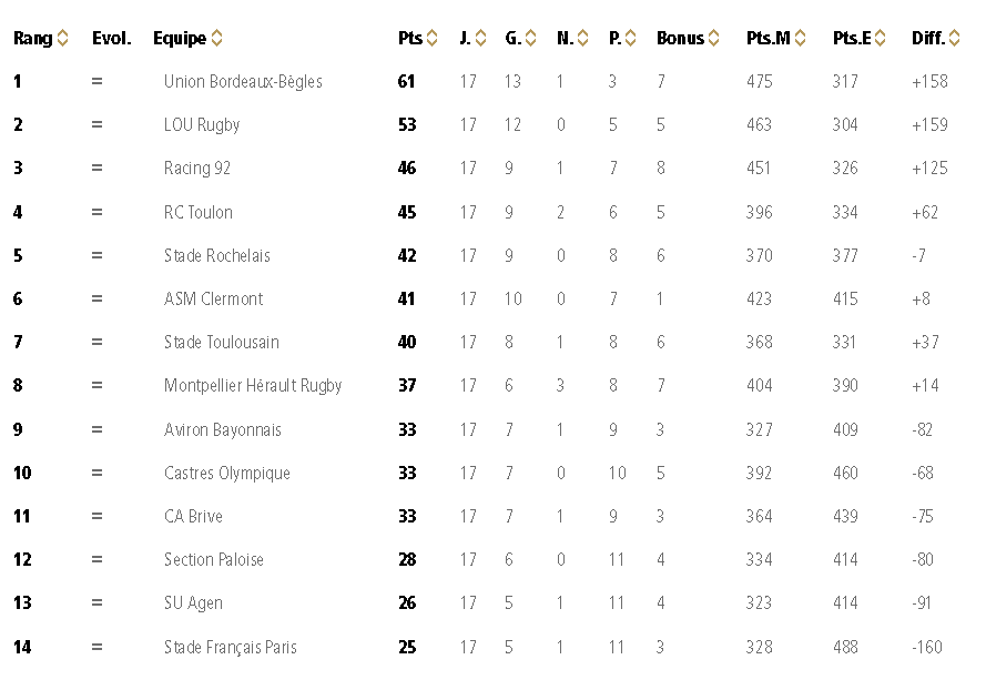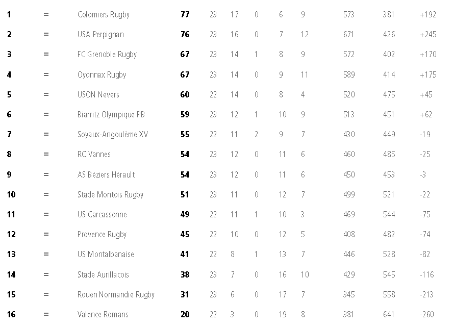 Ci-dessous les classements arrêtés TOP 14 et PRO D2.
