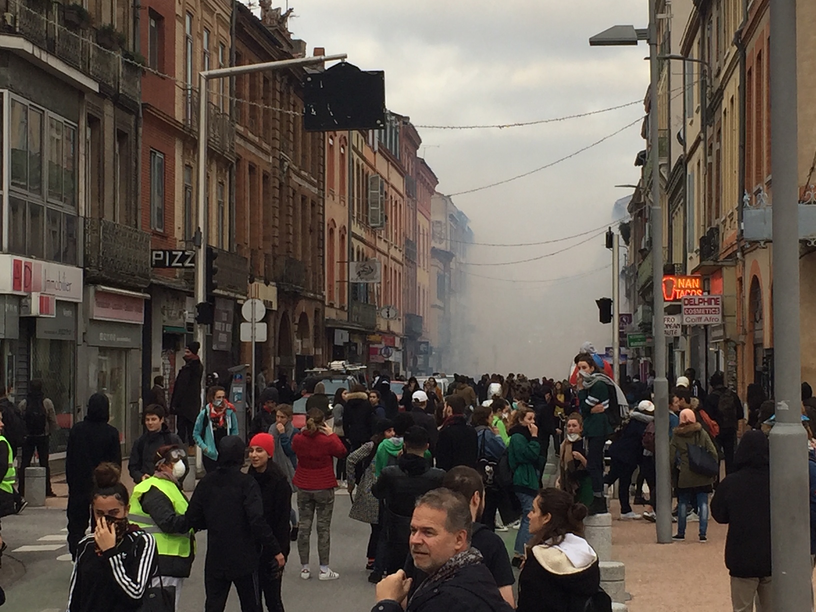 Le cortège protégé contrairement à la veille par les syndicalistes de la CGT - et composé également de quelques gilets jaunes - a été bloqué par les forces de l'ordre au moment d'emprunter la rue de la République. Des négociations ont été entamé avec les renseignements territoriaux, mais au moment où trois lycéens (Sophie de Déodat de Séverac, Nathan et Clément de Berthelot) ont été désignés pour rencontrer les services de l'Etat, la police a reçu des projectiles. Les forces de l'ordre ont alors répliqué à coups de gaz lacrymogènes, dispersants les manifestants.
