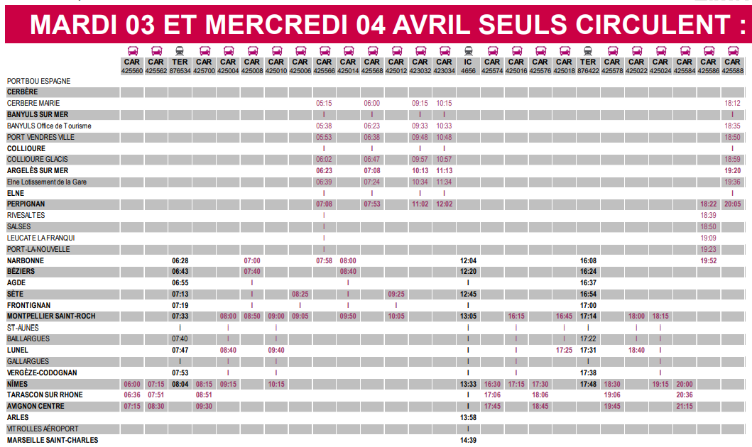 En Languedoc Roussillon, aucun TER ne circule entre Carcassonne et Quillan, idem entre Narbonne et Toulouse. Des bus de substitutions sont en place. Sur le littoral, la liaison Cerbère-Avignon est très perturbée également : Dans le sens Cerbère-Avigon : 2 TER uniquement, au départ de Narbonne jusqu'à Nîmes à 6h28 et 16h08. Un intercité aussi entre Narbonne et Marseille à 12h04. Le reste de la ligne est assurée par autocar.