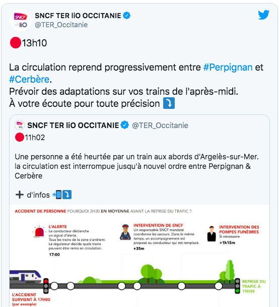 Dès 11 heures, la circulation a été interrompue entre Perpignan et Cerbère. Les passagers d'un train ont donc dû patienter pendant plusieurs heures avant une reprise progressive du trafic aux alentours de 13 heures.