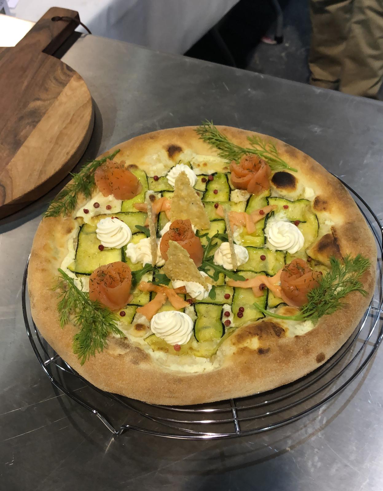 La jeune femme nous présente la pizza qu’elle a réalisé pour se qualifier : « on a fait une base de crème fraiche avec de l’ail et du citron. Dessus on a mis un damier de courgette qu’on a fait revenir à la plancha, après on a fait des fleurs de saumon parsemées d’aneth, et des pochages de carrés frais, avec de la ciboulette et du citron. » La pâte d’Amélie est aussi un élément primordial. « Nous utilisons une farine locale, ça joue aussi » confie la jeune femme.