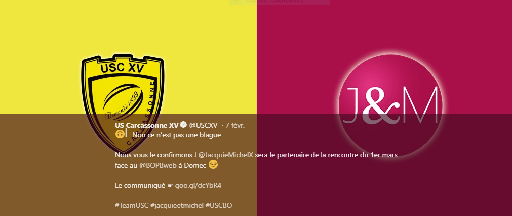 Merci qui ? Merci l’US Carcassonne pour une belle tranche de rigolade ! Le club de rugby de Pro D2 aura comme partenaire sponsor le célèbre site classé X Jacquie et Michel, le 1er mars prochain. Une rencontre au stade Albert-Domec face à Biarritz.