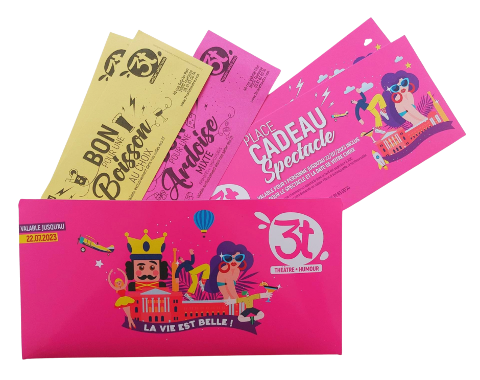 Le pack à gagner : 2 places cadeaux spectacles + 2 tickets boissons au choix + 1 ticket ardoise mixte de charcuterie et fromage, le tout glissé dans une jolie pochette.